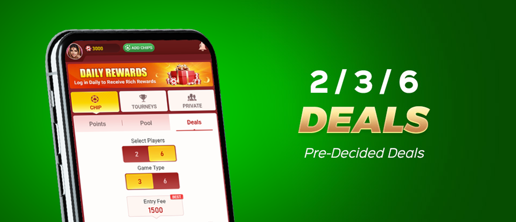 Deals Rummy, a distinctive version of Indian Rummy, is commonly enjoyed by 2 to 6 players as it presents a formidable challenge. In this game, a predetermined number of deals are played, as the name suggests. At the beginning, each player is given a set number of chips. The player with the greatest number of chips after the last deal is declared the victor.