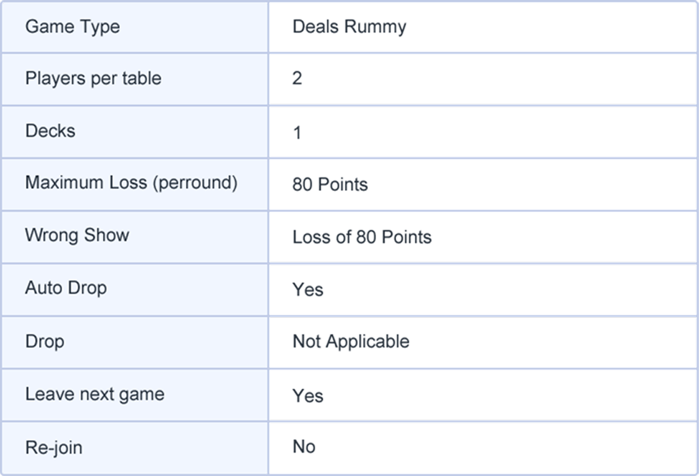 Typically, one or two standard decks of cards, including Jokers, are used to play Deals Rummy. Before the game begins, each player at the table is allocated a pre-defined number of chips, and the number of deals is also pre-determined.